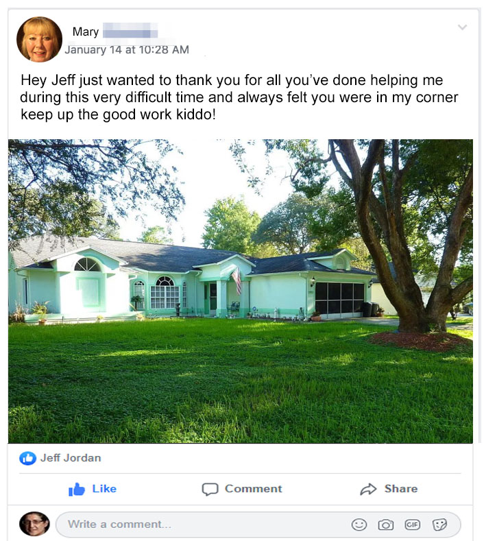 Jeff, I was scared, it all felt like too much but you help me and my son sell my home and understand everything I needed. I felt you take care of us like you were our family and thank you so much for showing us everything we needed at the right time always ready to help, thank you and God Bless you!